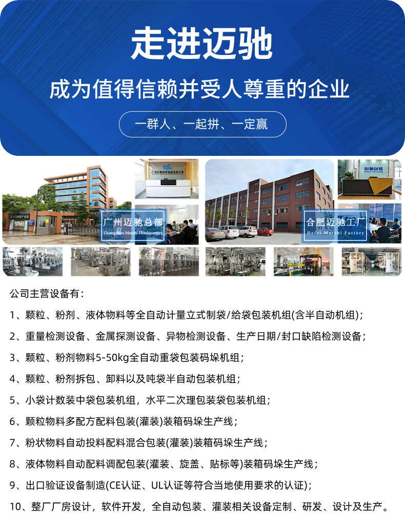 公司專注于不同類型包裝設(shè)備的研發(fā)與生產(chǎn),涵蓋了液體包裝機(jī)、粉劑包裝機(jī)、顆粒包裝機(jī)、立式包裝機(jī)等多種設(shè)備。無論是用于快速生產(chǎn)的自動(dòng)化設(shè)備,還是適用于特殊物料包裝的定制化設(shè)備,邁馳都能提供適合的解決方案,幫助客戶快速完成包裝任務(wù)。